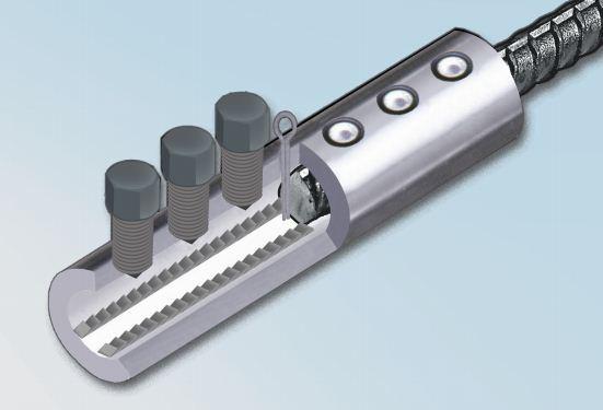 The Dayton Superior Bar Lock® Coupler System provides a simple, quick, cost effective method for splicing smooth or deformed rebar in tension and/or compression applications. Bar Lock® couplers are effective when used as a "positional" coupler when the rebar is fixed in place or when the rebar is free to rotate. Bar Lock® couplers utilize lock-shear bolts and serrated grip rails to mechanically splice the rebar. The serrated grip rails are embedded in the rebar as the lock-shear bolts are tightened. The heads of the lock-shear bolts are designed to shear off at a prescribed torque to ensure proper installation.