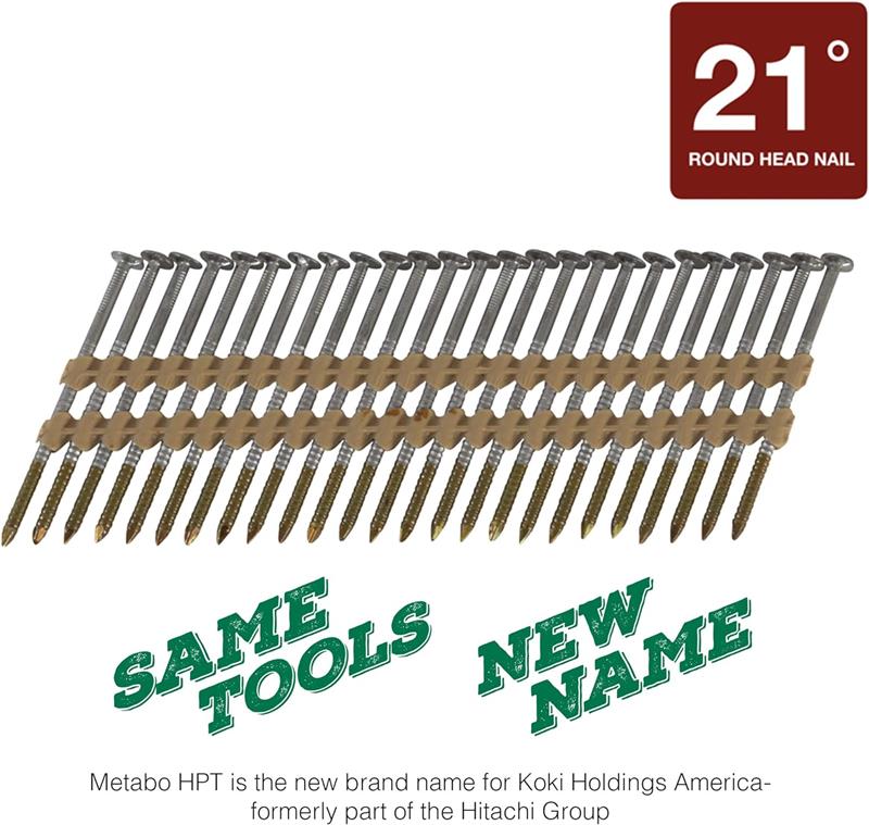 TYPE: 21 Gauge Full Round Head Ring Shank Plastic Strip Nails APPLICATION: Nail provides excellent holding power in most wood applications COUNT: 5,000 per box LENGTH: 2-3/8 Inch x .113 TREATMENT: Bright Basic COMPATIBILITY: Compatible with the Metabo HPT NR83A5, NR83A5(S), NR90AES1, NR90AC5, NR1890DRS