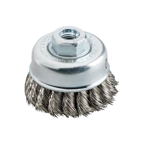 This cup brush is designed for universal use in stainless steel processing, making it ideal for smoothing welding seams and points, stripping slag, scales, and old paint. It features twisted stainless steel wire for efficient material removal.