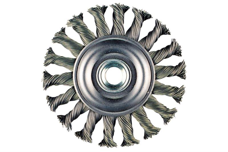 This wire cup brush is designed for universal use in metal processing, making it ideal for smoothing welding seams and points, stripping slag, scales, and old paint. It features hardened steel-wire edging, ensuring high durability and efficiency.