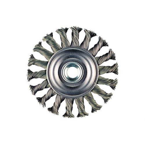 This wire wheel brush is designed for universal use in metal processing, making it ideal for smoothing welding seams and points, stripping slag, scales, and old paint. It is especially suitable for processing narrow workpieces and inner edges and features hardened steel-wire edging for high durability and efficiency