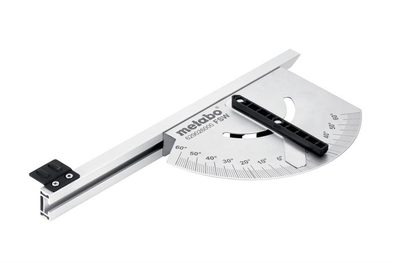The Metabo FSW Miter Fence (629026000) is designed for precise alignment of the guide rail to the workpiece. It features an angle adjustment range from -60° to +60°, allowing for accurate and versatile cuts. Constructed from durable metal, it ensures long-lasting performance and reliable stability during use. This miter fence is compatible with Metabo FS guide rails, making it an essential accessory for professionals and DIY enthusiasts who require precision in their cutting applications.