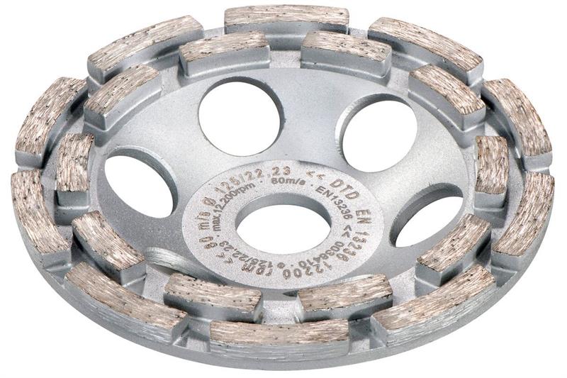 The Metabo Diamond Cup Grinding Wheel Concrete "Classic" Ø 125 mm (628209000) is a powerful, double-coated diamond cup wheel designed for grinding thick concrete layers, leveling concrete and granite, and removing sludge skins and formwork seams. It is also effective for removing hard cement, chalk-cement plaster, and hard screed. With a maximum working speed of 80 m/s, this grinding wheel ensures efficient material removal and smooth surface finishing.