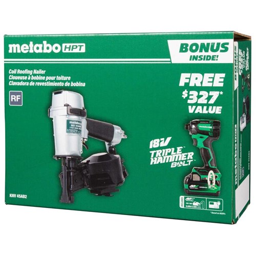 Metabo HPT introduces the new Pro Bundle 1-3/4" Coil Roofing Nailer with BONUS Impact Driver Kit! This limited time offer includes everything a pro needs to get the job done. This bundle includes our Pro Preferred Coil Roofing Nailer, 18V Cordless Triple Hammer Bolt Impact Driver (WH18DCQ4), 18V/36V MultiVolt 5.0Ah Water & Dust Resistant Battery (380083M), and charger. The Coil Roofing Nailer (NV45AB2), is extremely lightweight, (only 5.7 Lb.) making it the essential tool for the fast-pace working environment. It features rapid driving and unprecedented quick response with unique cylinder valve firing mechanism allowing you to fire up to 3 nails per second. The Coil Roofing Nailer will fire all standard Roofing Nails ranging in size from 7/8 In. to 1-3/4 In. Its depth of drive adjustment will allow the user to drive the nail to the desired depth at operating pressure ranging from 70 to 120 psi.