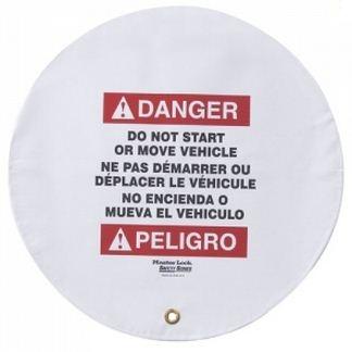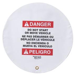 The Master Lock No. 4716 Steering Wheel Cover provides visual deterrence during vehicle maintenance. The 16in (41cm) cover can be locked in place with a 421 hasp and safety padlock. For added security, use the S806 adjustable locking cable around steering wheel and foot pedals. Trilingual warning (English, French and Spanish) notifies employees not to start or move vehicle.