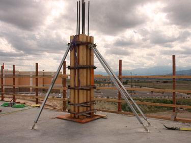 Close view of a column setup with 2 braces for one side and 1 brace on the other.