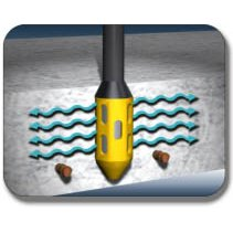 Epoxy coated rebar presents a particularly troublesome problem. Steel heads act like an electric hammer, striking any rebar or forms they contact, over 10,000 times per minute, with a force from hundreds to over 2,000 pounds per blow. Contact with a steel vibrator head of as little as one second can chip enough coating to subject the steel to deep rust. Oztec's patented High Efficiency "RubberHeadTM" vibrator head not only meets DOT non-metal head specifications for protecting coated rebar and expensive forms, but exhibit some very special and unique properties. The High Efficiency "RubberHeadTM" urethane dimpled construction sends strong shock waves off the entire length of the head, with a larger radius of action, producing denser concrete with less voids to patch.