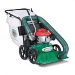 The new unit features a 5-blade impeller with serrated edges to maximize both suction and debris reduction. Variable height adjustment for either hard surface or turf work, and all the material is accumulated in a breathable-hard bottom mesh turf bag with an integral dust cover. For convenience, bag zippers have been eliminated in favor of simple to use marine style clasps that open and close easily when emptying debris. Honda or Briggs power combine with 12" smooth tread wheels as well as the optional rear-wheel self propelled for hilly turf applications, make operation simple in any environment.