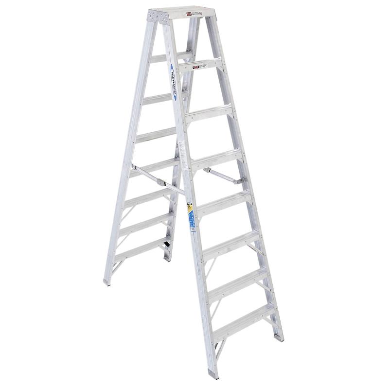 The aluminium Multi-Use Twin Stepladder T400 series has a duty rating of 375 pounds per side making these ladders ideal for one or two-person jobs. The tops are made of heavy gauge extruded aluminum, and the steps are connected with a solid double riveted construction. The extra wide TRACTION-TRED® steps are slip resistant. The bottom steps are braced with full U channel knee braces.