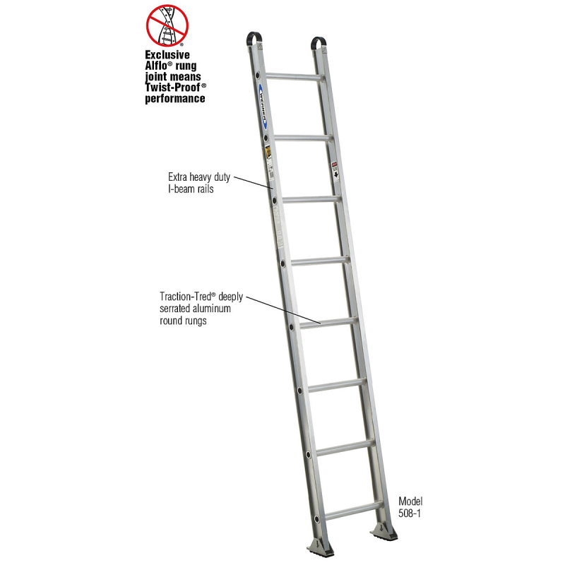 The 500-1 series are one-section round rung straight ladders with a duty rating of 375 pounds. The exclusive ALFLO rung joint means TWIST-PROOF performance every time. The side rails are extra heavy duty I-beam rails and the aluminum round rungs are deeply serrated for slip resistance. The duty rating goes to 300 pounds with the 18', 20' and 24' lengths.