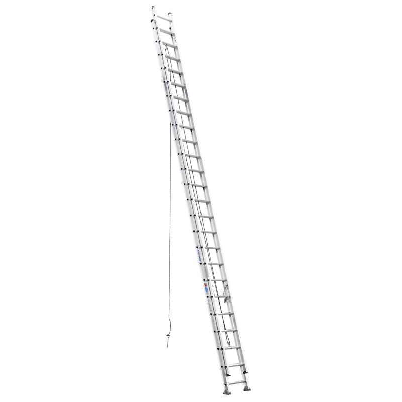 The D500-2 aluminum extension ladders have a duty rating of 375 pounds and feature the exclusive ALFLO rung joint for a TWIST-PROOF performance every time. The end caps are mar resistant and notched for easy separation of sections. Both the base and the fly sections can be used separately. Internal guides increase the ease of operation when raising and lowering. The feet are heavy-duty, self-aligning and free swinging for hard or penetrable surfaces. Rugged spring-loaded locks operate smoothly. TRACTION-TRED D rungs are slip resistant. Duty rating changes to 300 pounds for 36'-48' models