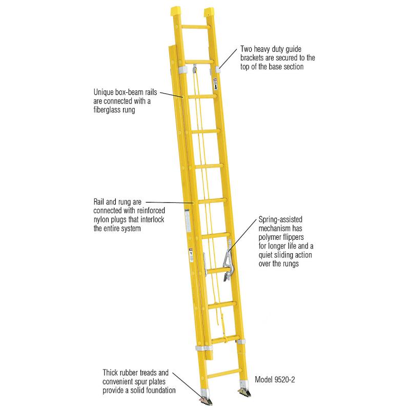 The 9500-2 All-Fiberglass Extension ladders are ideal in highly-corrosive environments. Where most fiberglass extension ladders have aluminum rungs, the 5900-2 series has unique box-beam rails that are connected with a fiberglass pultruded rung. Nylon plugs interlock the entire rung-to-rail connections. Two heavy duty guide brackets are secured to the top of the base section for ease of operation. Thick rubber treads and spur plates provide a solid foundation at the foot. These ladders bear a duty rating of 300 pounds.