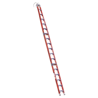 The TPF00-1 ladders are posting ladders with a tapered design of the rails and 1" diameter solid aluminum hooks with aluminum rail shields at the top of the ladders. The large 9 3/4" hook opening allows for easy attachment on the job. Center anchor points distribute the load to each rail, and fall protection tie-offs are located every 5 to 6' along the length of the ladder. The 3" slip-resistant TRACTION-TRED steps are double riveted and braced on the front and back. The TPF00-1 series has a duty rating of 300 pounds.