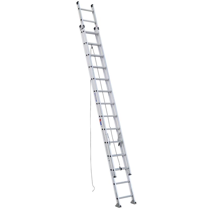 The D1500-2 series aluminum extension ladders have a duty rating of 300 pounds and have extra heavy duty I-beam side rails. The base and fly sections separate easily and can be used separately. Guide brackets help to ease operation when raising and lowering the fly section. The exclusive ALFLO rung joint means TWIST-PROOF performance every time. TRACTION-TRED D rungs are slip resistant, and the rugged shoes rest flat or are held in spur position with the SHU-LOK feature. Rugged spring-loaded locks operate smoothly. Mar-resistant end caps protect the surface ladder is resting against.