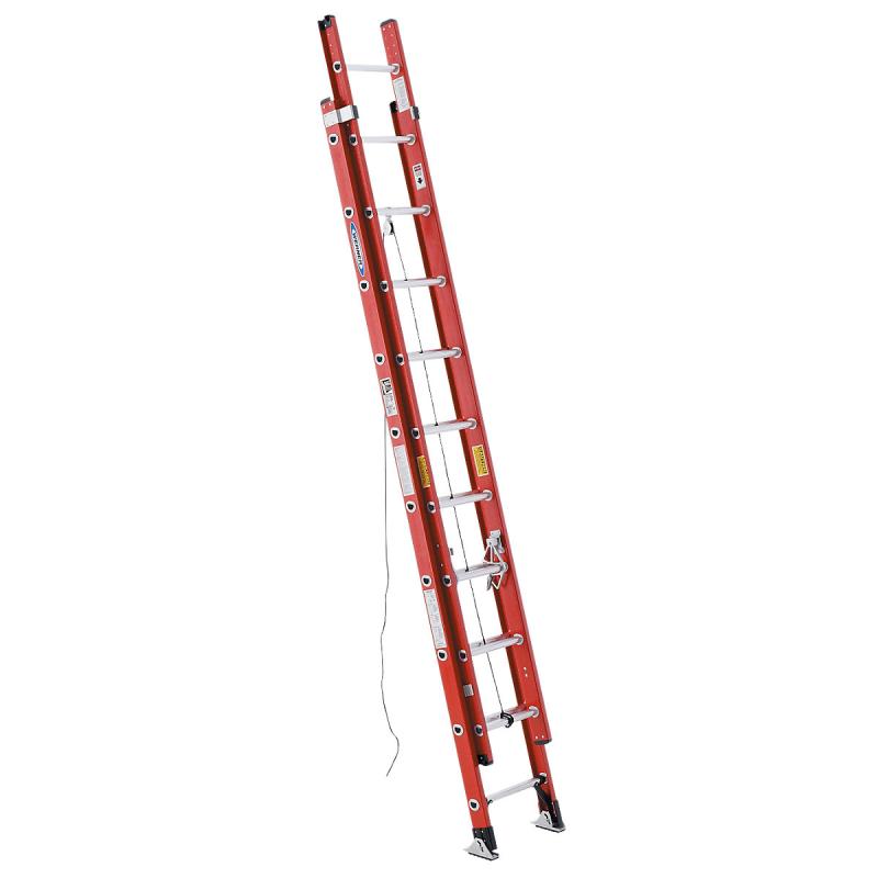 The D6200-2 fiberglass extension ladders have non-conductive rails making these ladders ideal for working near electricity. With a duty rating of 300 pounds, the D6200-2 series is durable and long lasting. The exclusive ALFLO rung joint means TWIST-PROOF performance on the job. The Traction-Tred D rungs are slip resistant and the side rails are interlocking. The dual action feet are for use on hard or penetrable surfaces and swivel easily. The base and fly sections separate easily to use the base section as a single ladder. The durable rail shield bracket and shoe help protect the bottom of the rail. The fly section rails are pre-pierced at the top for easy field installation of accessories.