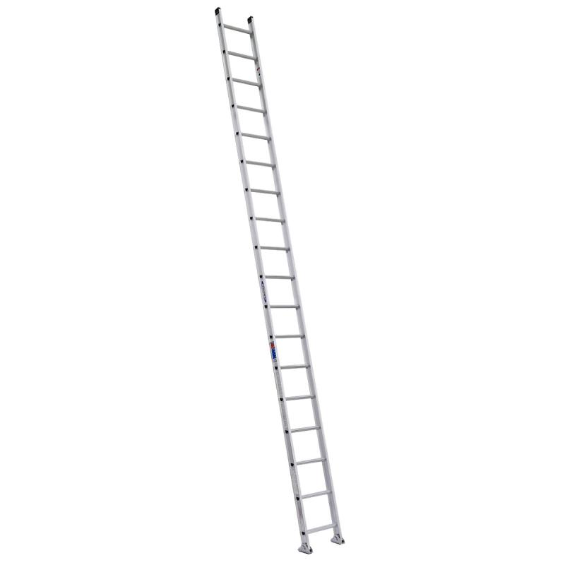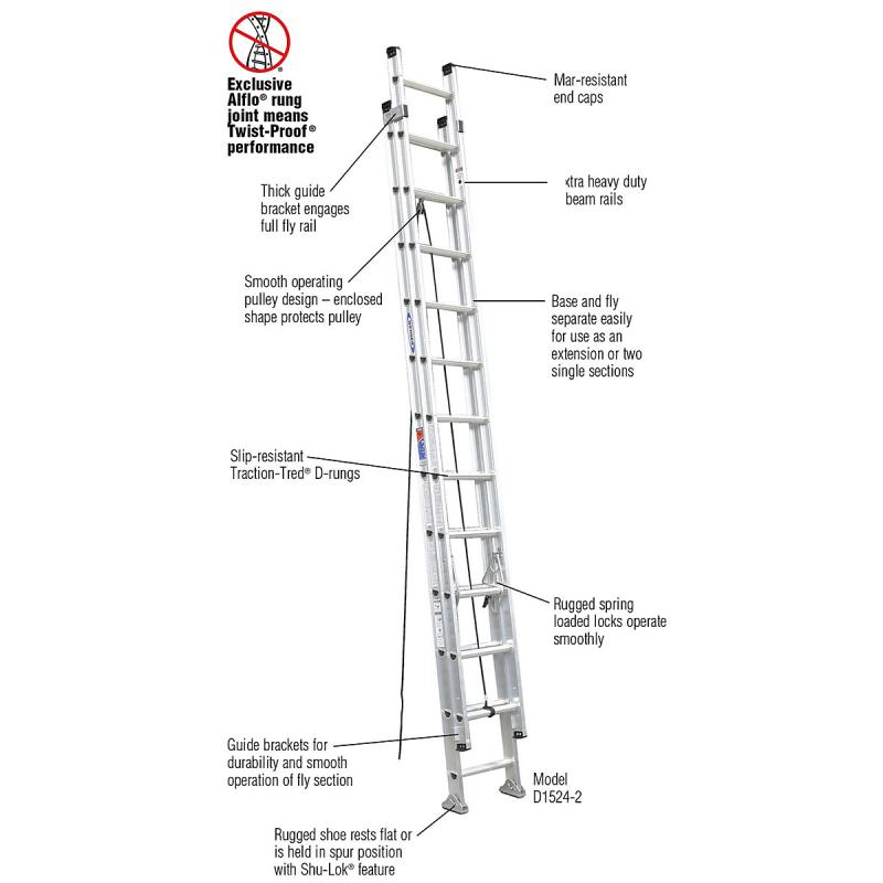 The D1500-1 series are one-section aluminum straight ladders with a duty rating of 300 pounds. The exclusive ALFLO rung joint means TWIST-PROOF performance every time. The side rails are extra heavy duty I-beam rails and the aluminum D Traction-Tred rungs are slip resistant. The rugged shoe rests flat or is held in spur position with the Shu-Lok feature for use on hard or penetrable surfaced