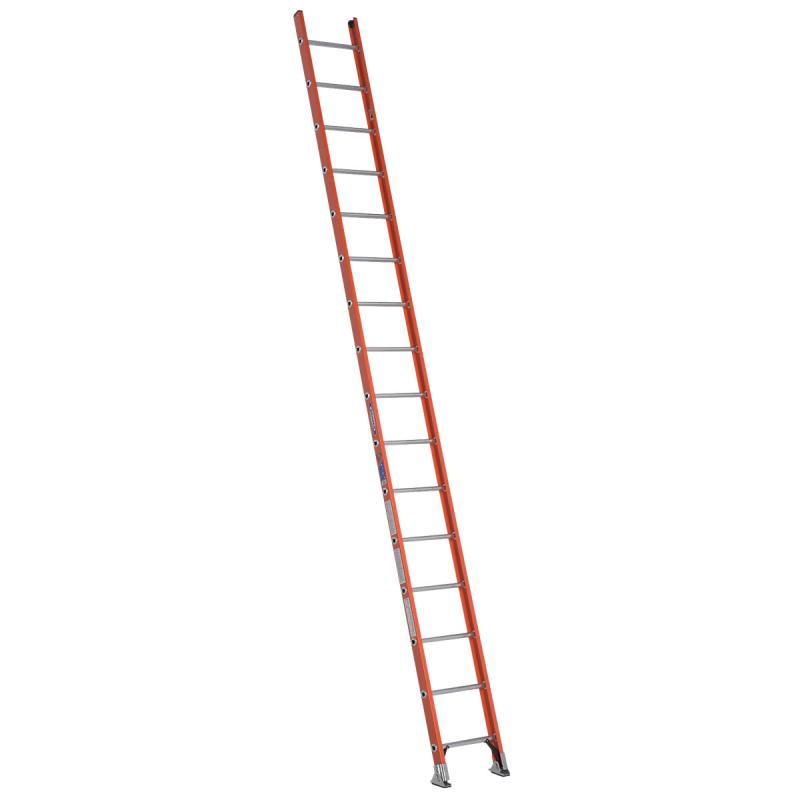 The D6200-1 ladders are one section straight ladders made with non-conductive fiberglass rails. Easy to transport and maneuver, these ladders bear a duty rating of 300 pounds making them durable and long lasting. The TRACTION-TRED D rungs are slip resistant, and the durable rail shields and shoe brackets help to protect the rails from damage. The dual action feet pivot for use on hard or penetrable surfaces
