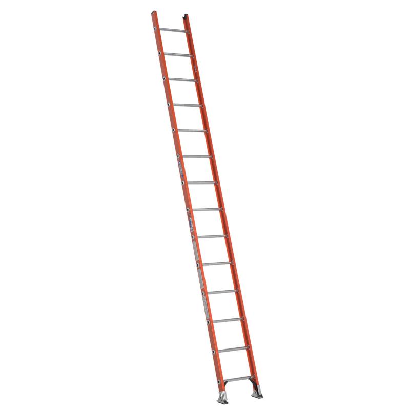 The D6200-1 ladders are one section straight ladders made with non-conductive fiberglass rails. Easy to transport and maneuver, these ladders bear a duty rating of 300 pounds making them durable and long lasting. The TRACTION-TRED D rungs are slip resistant, and the durable rail shields and shoe brackets help to protect the rails from damage. The dual action feet pivot for use on hard or penetrable surfaces.