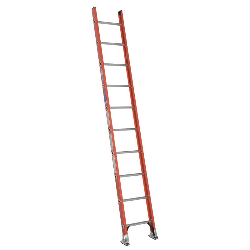 The D6200-1 ladders are one section straight ladders made with non-conductive fiberglass rails. Easy to transport and maneuver, these ladders bear a duty rating of 300 pounds making them durable and long lasting. The TRACTION-TRED D rungs are slip resistant, and the durable rail shields and shoe brackets help to protect the rails from damage. The dual action feet pivot for use on hard or penetrable surfaces