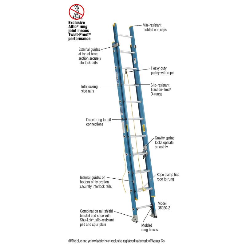 The D6000-2 series fiberglass extension ladders have non-conductive side rails and a duty rating of 250 pounds. The TRACTION-TRED D rungs are slip resistant and the side rails are interlocking. The rail shields protect the bottom of the rail and the SHU-LOK shoe pivots easily for use on hard or penetrable surfaces. The exclusive ALFLO rung joint guarantees TWIST-PROOF performance.