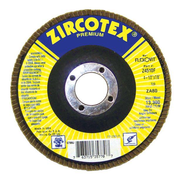 Flexovit ZIRCOTEX Premium Type 29 Flap Discs are made with premium zirconia alumina abrasive cloth backed by an aluminum disc for extra rigidity. Ideal for high production grinding, blending, deburring and finishing, they perform well on a wide variety of materials including stainless and carbon steel. This durable grain resists loading or clogging on softer materials such as aluminum, brass, bronze and fiberglass. Available in Type 29, with a 7/8 arbor or a 5/8-11 spin-on zinc hub.