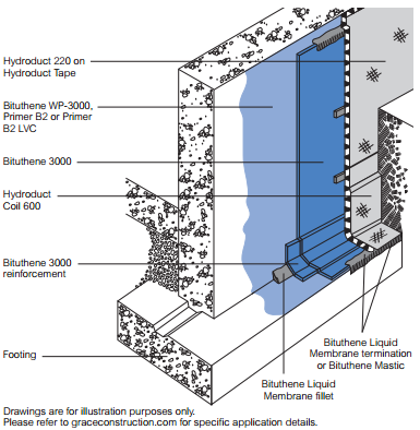 Bituthene is ideal for waterproofing concrete, masonry and wood surfaces where in-service temperatures will not exceed 130°F (54°C). It can be applied to foundation walls, tunnels, earth sheltered structures and split slab construction, both above and below grade. (For above grade applications,see Above Grade Waterproofing Bituthene 3000 and Bituthene Low Temperature.)