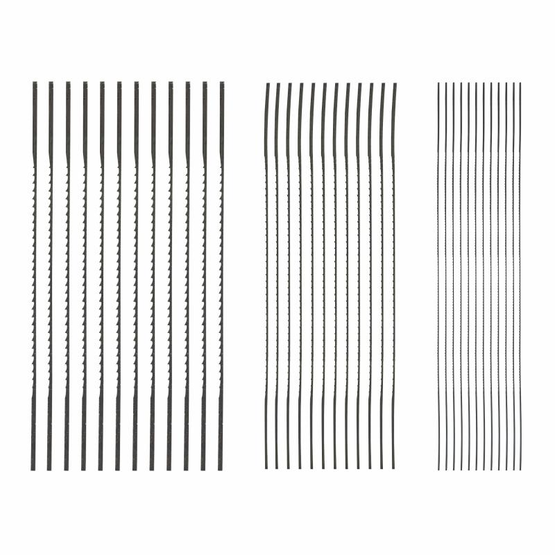 Package Contents: 36 BladesProgressive Blade Tooth Spacing: NoSet / Individual: SetJig Saw Blade Type: Scroll Saw Plain-EndBlade Thickness (In): .110Blade Material: SteelSaw Blade Type: Scroll SawBlade Type: Plain End Scroll Saw BladesMaterial Cut: WoodBlade Lengths: 5 In.