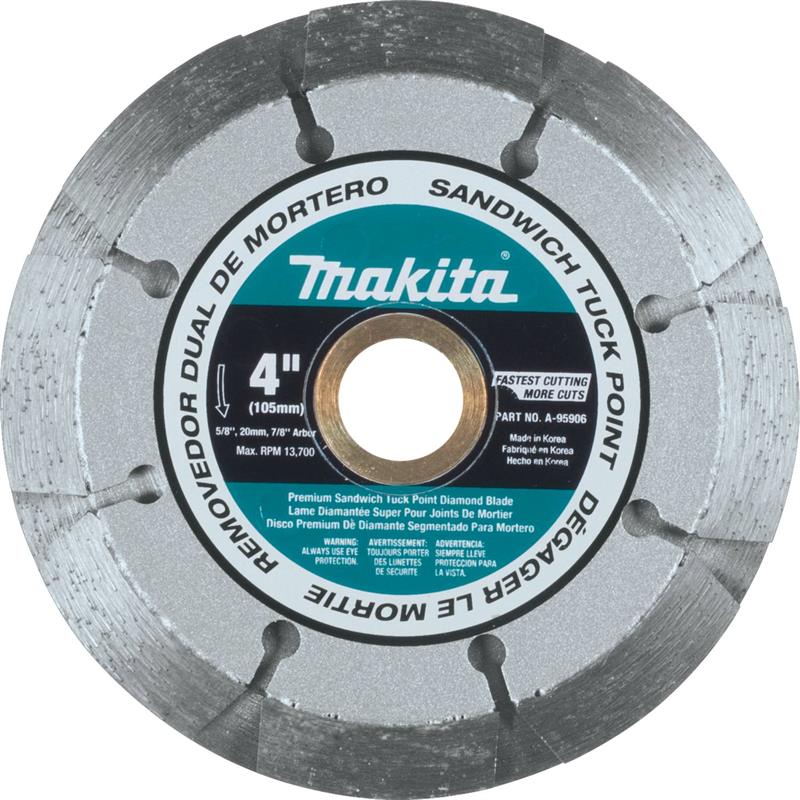 The Makita 4" Dual Sandwich Diamond Tuck Point Blade is designed for faster more efficient cuts than standard solid tuck point blades. The design is engineered to create less dust than solid equivalent blades. The Dual Sandwich Diamond Tuck Point Blade is ideal for the removal of mortar joints. For added versatility, the blade can be used wet or dry.