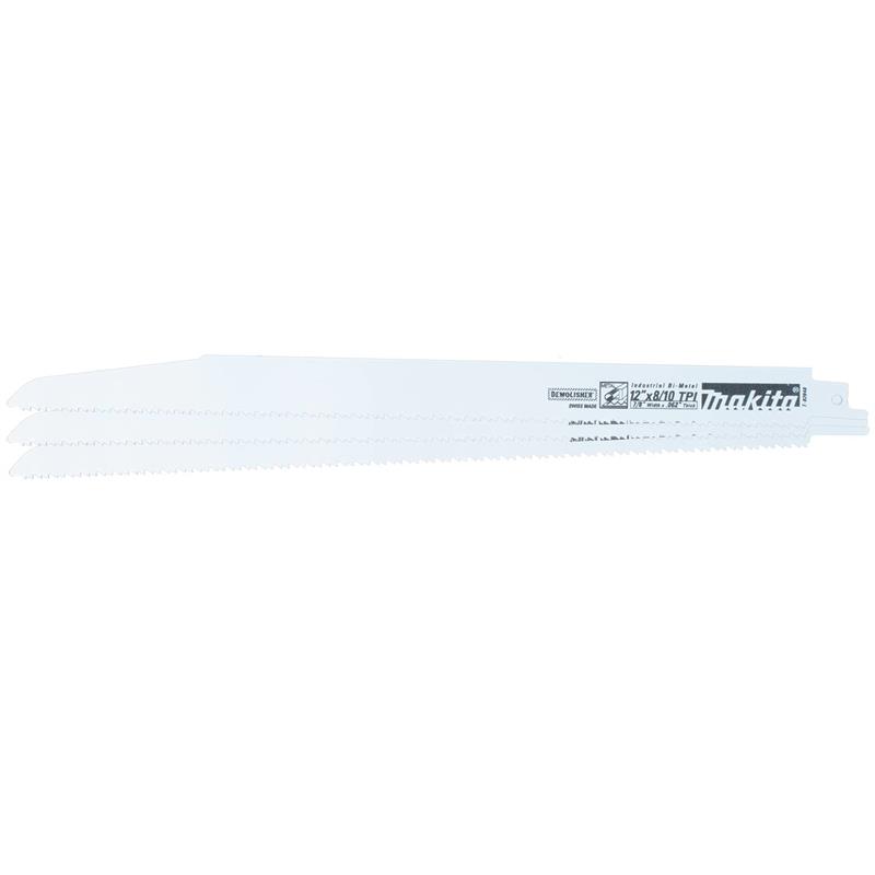 Makita reciprocating saw blades are engineered for industrial applications. The Makita Demolisher™ 12 in. 8/10 TPI Bi-Metal Demolition Reciprocating Saw Blade (T-02048, 3/pk) features cobalt content, .062" thickness and 7/8" width for increased resistance to bending and longer blade life. The Makita Demolisher™ Blade is ideal for a range of cutting and demolition applications including metal pipe, channel and angle iron.