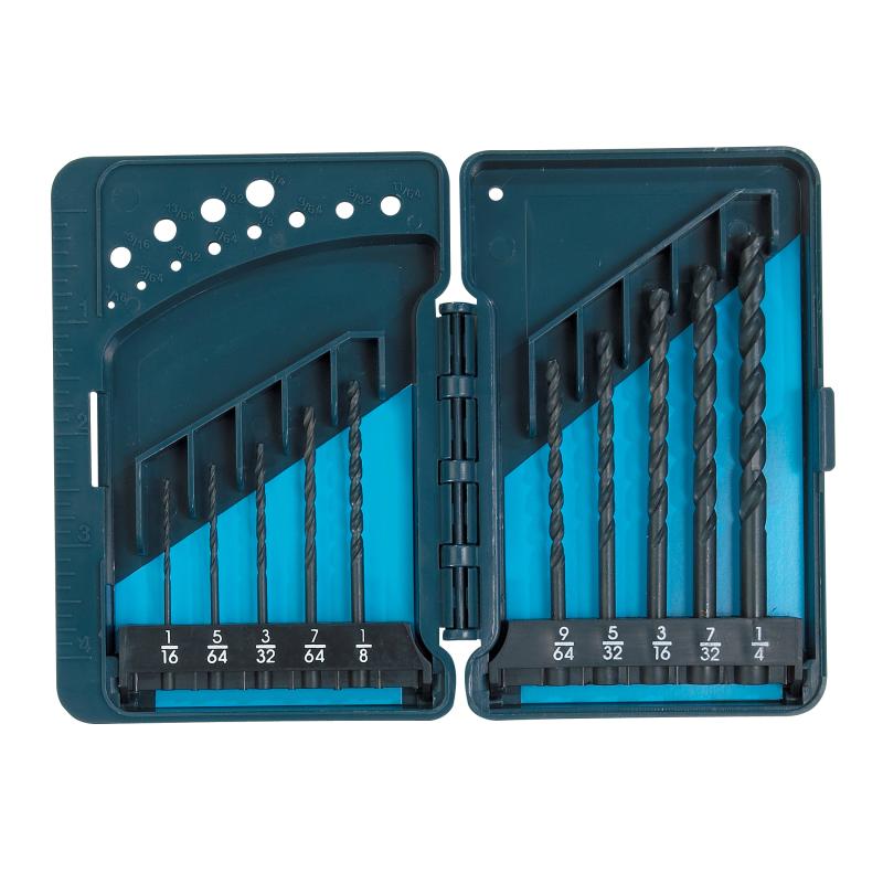 Bit Sizes: 1/16, 5/64, 3/32, 7/64, 1/8, 9/64, 5/32, 3/16, 7/32, and 1/4 InCase Included: YesDrill Bit Type: TwistNumber of Pieces: 10Package Contents: 10 Piece black oxide drill bit set in plastic molded caseRecommended Safety Equipment: Safety glassesBit Material: Black Oxide
