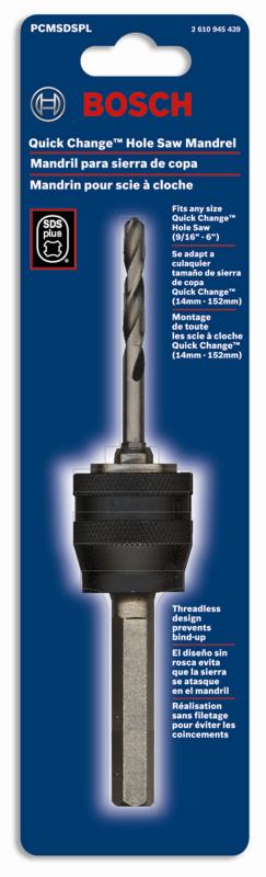 Chuck Fitment: SDS-PlusColor / Finish: MetalCorresponding Drill Bit Included: YesDiameter (in): 0.375Fits Brand / Models: Bosch Bimetal Hole SawsMandrel Type: Hole SawMaterial: High Speed SteelQuick Change Kit: NoMinimum Chuck Size Required: 1/2 In.